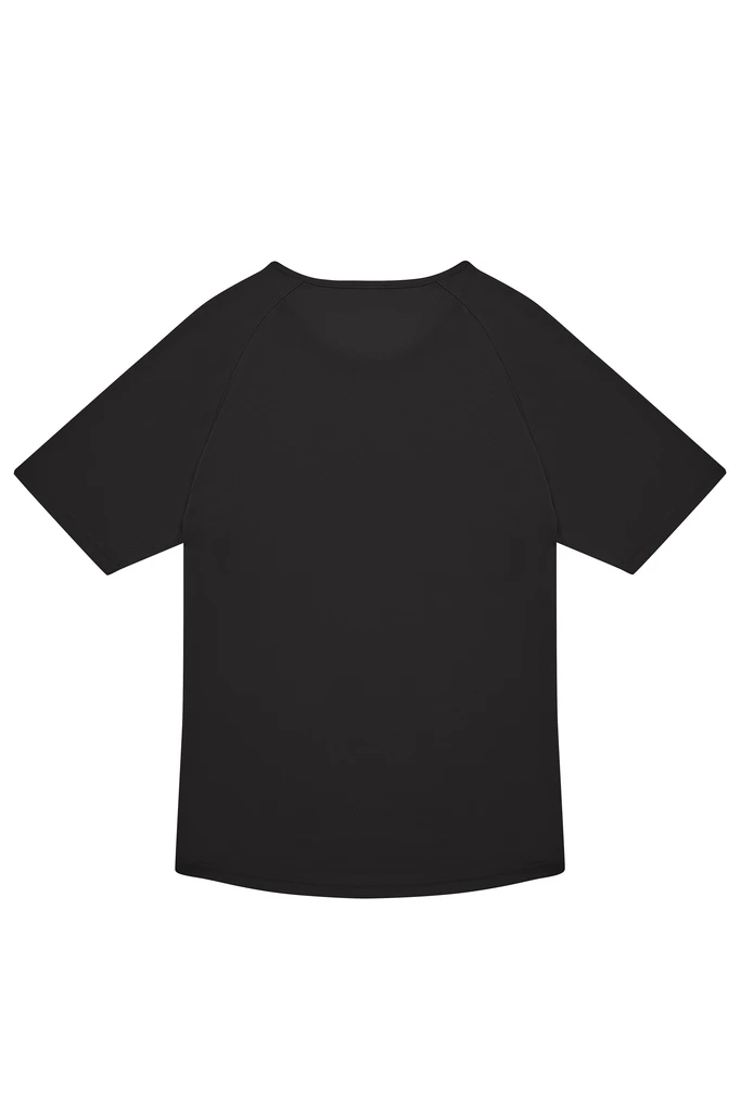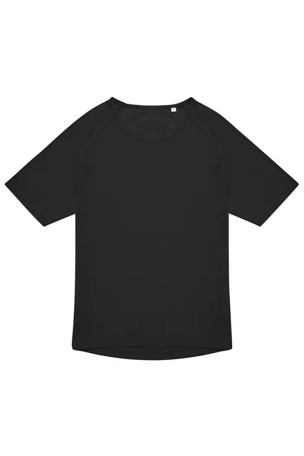 Breathability, inherent wicking (mesh); quick drying; raglan sleeves; side seams.