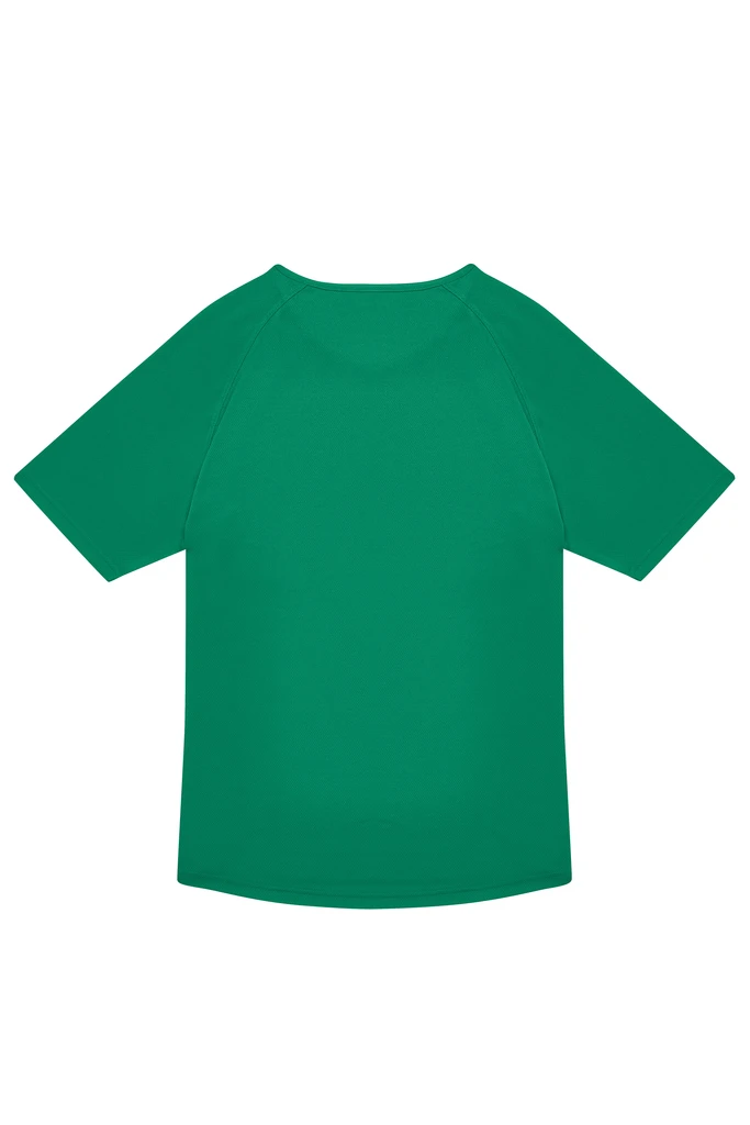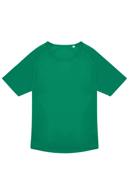 Breathability, inherent wicking (mesh); quick drying; raglan sleeves; side seams.
