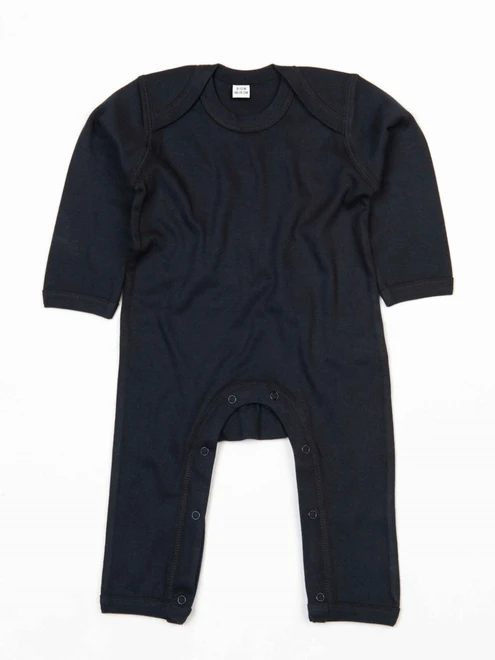 Long sleeves, full body romper suit | Envelope neck opening | Self-bound cuffs, leg opening and neck | Finished with narrow cover stitch to armhole and inside leg opening | Self-colour nickel-free snap poppers to leg opening | Neutral size neck label for easy relabelling