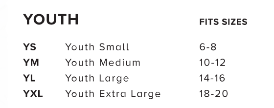 | Sizes | YS, YM, YL, YXL |