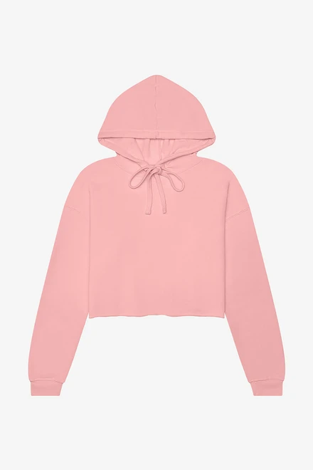 This trendy womens cropped hoodie sweatshirt is a must-have for your fall wardrobe. Its raw edge and dyed to match drawstrings make it fashion forward while the poly cotton brushed fleece brings an unmatched level of comfort.
