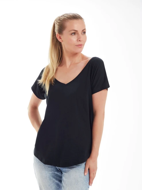 Loose fit / Wide, deep V neckline / Curved hem / Narrow binding at neck / Tear-off label