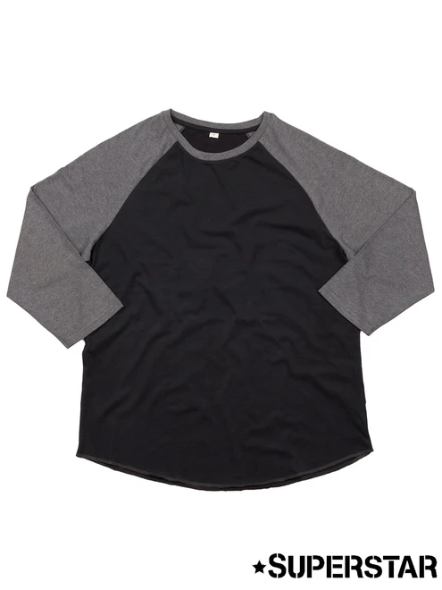Modern fit / Soft-handle peach finish fabric / curved raglan seams / 3/4 length sleeve / curved hem with contrast overlock edge / Tear-off label