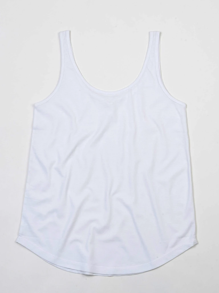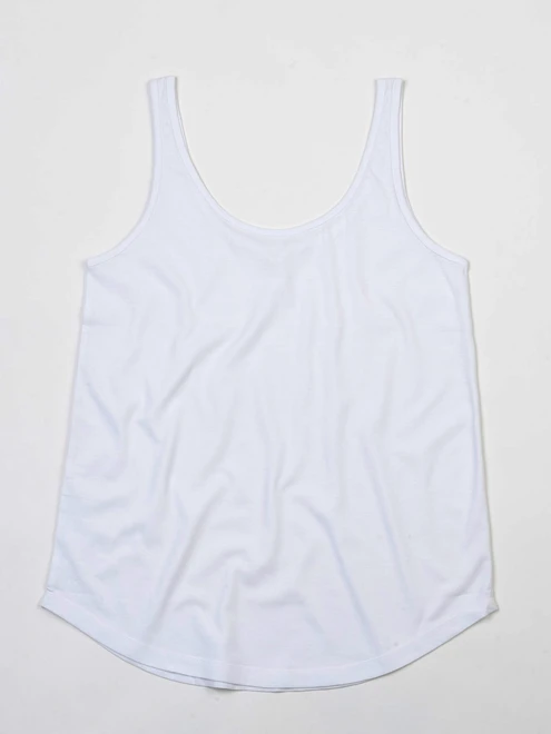 Loose fit, longer length vest / Lighterweight fabric / Curved hem / Binding at neck and armholes / Lower front and back neck / Twin needle hem / Tear-off label