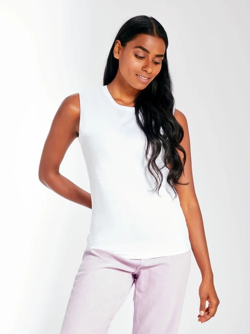 Loose Fit crew neck sleeveless T / Raw edges at armhole / Narrow rib at neckline / Longer length, contemporary fit / Tear-off neck labelling