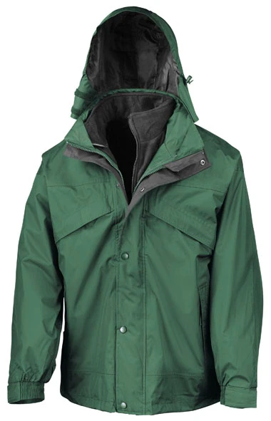 100 % polyester • jacket outside waterproof (taped seams) • hood in collar (with tear release fastening) • 2-way full zip and windproof flap with press studs • four front pockets with zip and showerproof flaps • adjustable elasticated hem with cord pull • access for decoration on left chest and in back lining • removable inner jacket made of 280 gsm black polyester fleece