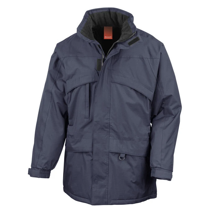 Outer: Ripstop Polyester with PVC coating • Lining: upper body fleece • lower body 190T Nylon Taffeta® • Padding: 150 gsm Polyester • taped seams • detachable adjustable hood with tear release closing chin guard • concealed zip with storm flap and tear release closing • zip opening under arm vents with mesh backing • elasticated cuffs with tear release adjuster • 2 chest pockets and 2 front pockets with zip • several inside pockets incl. phone pocket • cable loops • ID-card holder • adjustable waist and hem with elasticated drawcord and stoppers • reflective panel on lower back • access for decoration on left chest and back.