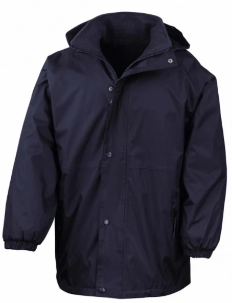 280 gsm • 100 % polyester • one side waterproof PVC coating • hood in collar (with zip) • full zip • polyester side also has windproof button placket • elasticated cuffs • zipped side pockets • press stud opening in hem for decoration.