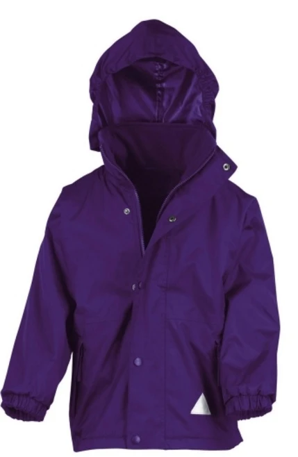 280 gsm • 100 % polyester • one side waterproof PVC-coated • hood in collar (with zip) • 2-way full zip • polyester side also has windproof button placket • elasticated cuffs • zipped side pockets • press stud opening in seam for decoration.