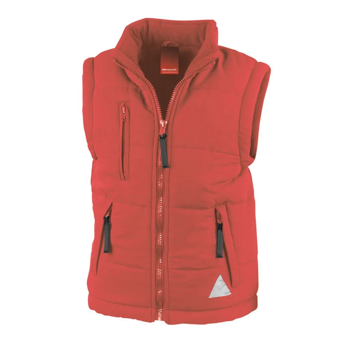 Outer fabric: 100 % polyester micro fibre • padded lining: 100 % polyester fleece • collar with concealed hood • quilted body • tone-on-tone zip • side pockets and chest pocket with zip • sizes L and XL with inside phone pocket • armholes and hem adjustable due to elastic drawcord with stoppers • 3M™ reflective panel on front and back • access for decoration on left chest and back.