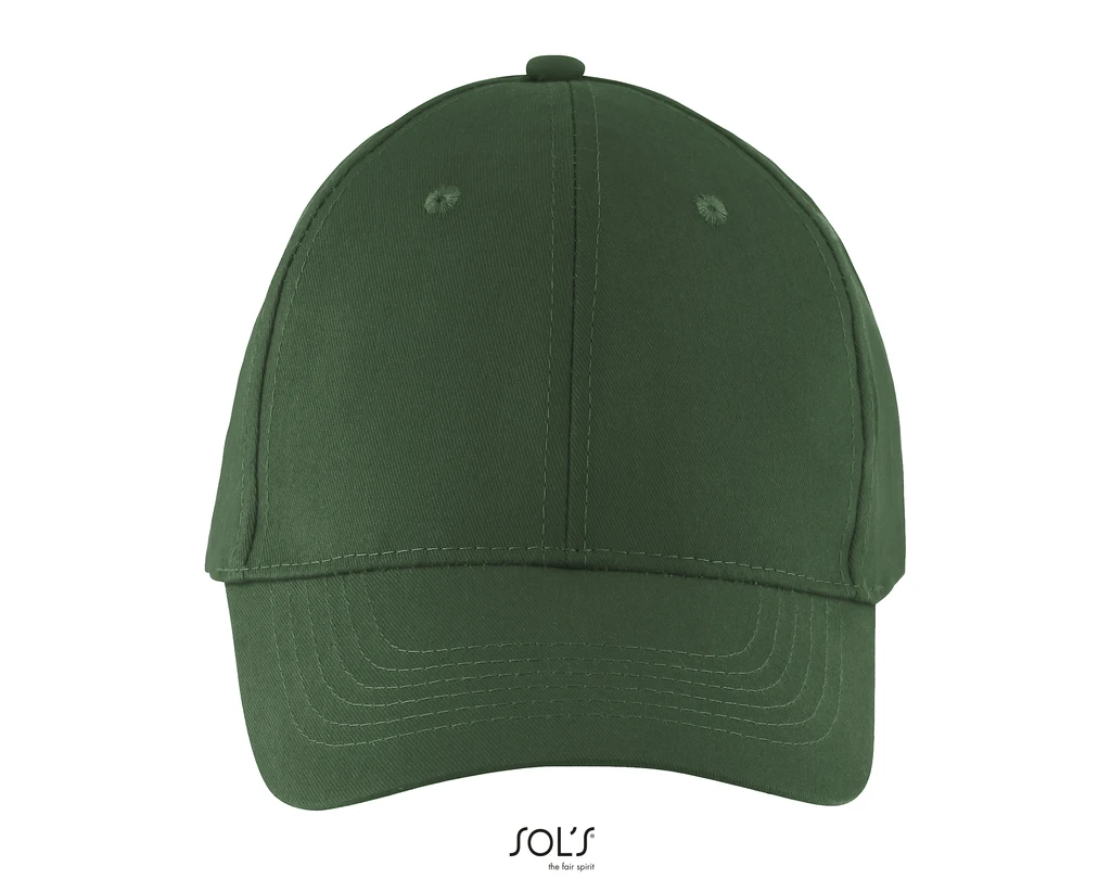 QUALITY : TWILL 180 - 100% light brushed cotton; Six panels, Pre-curved peak with sandwich option, 6 embroidered eyelets, Adjustable self-gripping back fastening
