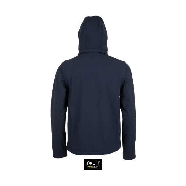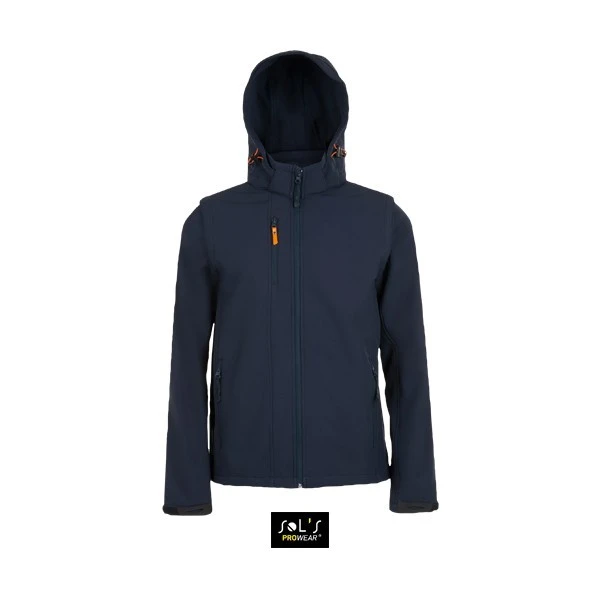 SOFT SHELL 340 - UNISEX - 3 layers, outside: 94% polyester - 6% elastane, inside: microfleece 100% polyester, TPU Membrane - 8000 mm waterproof and breathable membrane; Zip fastening, 3 zip pockets, removable sleeves and peaked hood, drawcord at hood and bottom