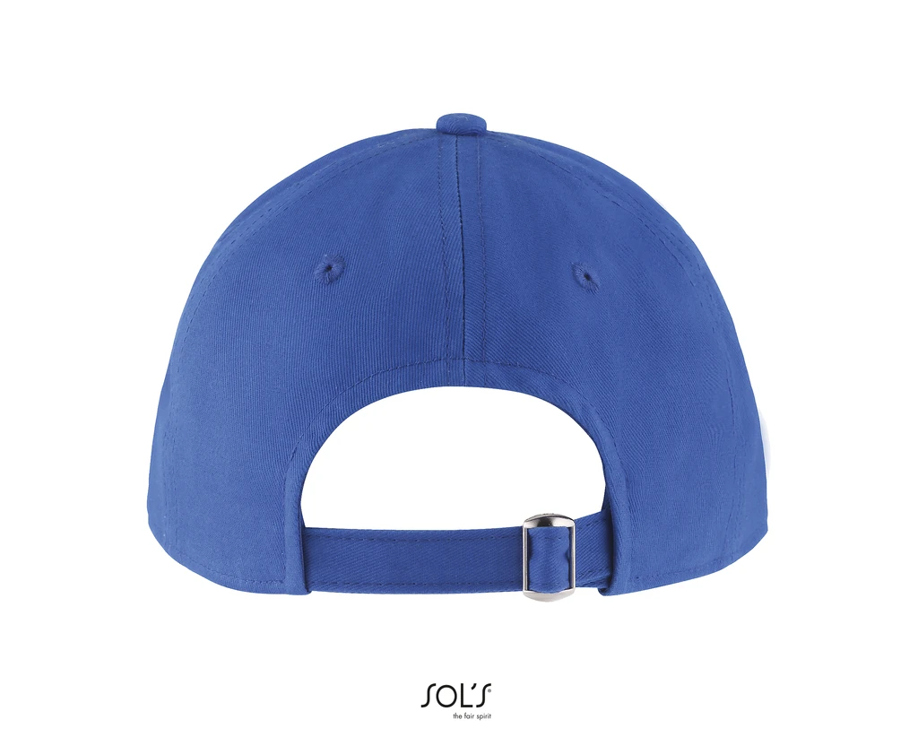 QUALITY : TWILL 285 - 100% unbrushed cotton; Six panels, Structured front panel, Pre-curved peak, Cotton twill padded headband, 6 embroidered eyelets, Modern adjustable back fastening with metal buckle