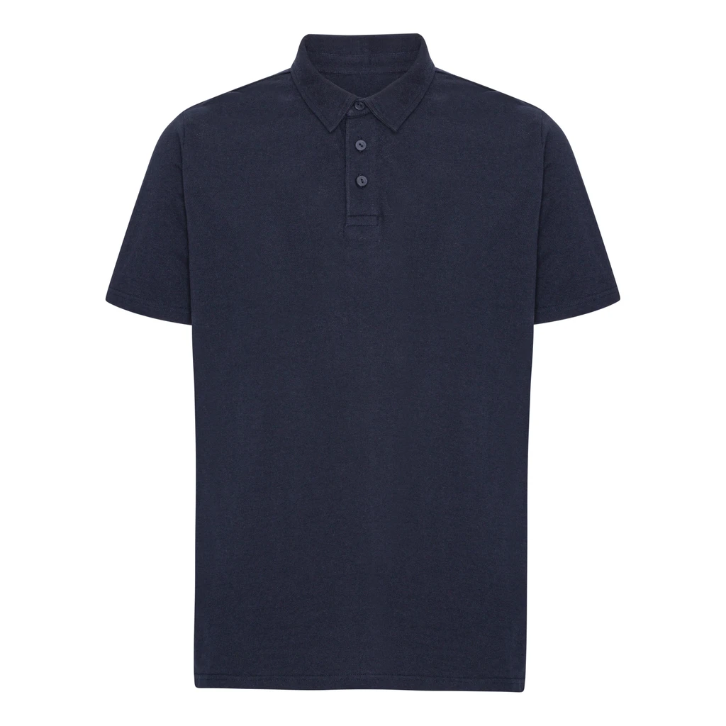 Classic tailored Polo Shirt with slightly fitted short sleeves and front placket with buttons made from pressed waste cotton. Features a flat-knitted collar and sleeve cuffs, small slit detail at sides and double-stitched finish at sleeve and bottom hem. Body fabric made from piqué knitted 235gsm combed cotton.