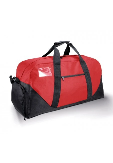 Travel / leisure / sports bag in 600D PVC backing. Detachable and adjustable shoulder strap, side zip pocket, transparent slot for luggage identification, reinforced handles, plastic stabilizers, side shoe holder pocket. SBS zip.