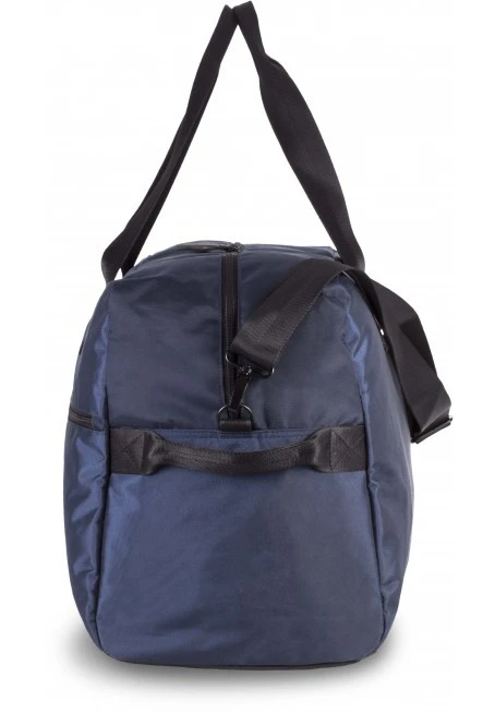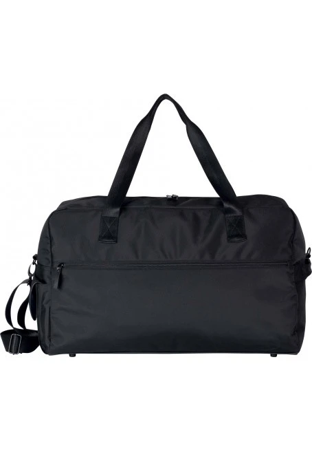Travel bag in 900D polyester. Handles, shoulder strap and metal details. 1 zipped front pocket for easy decoration access, 1 side pocket with press stud, 1 side handle and polyester inside lining with zipped pocket. Rigid bottom in imitation leather with protective plastic feet.