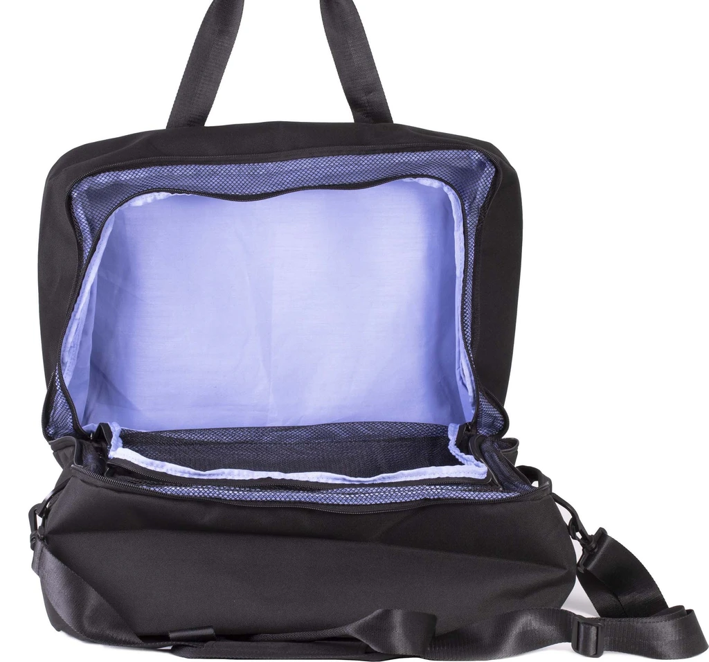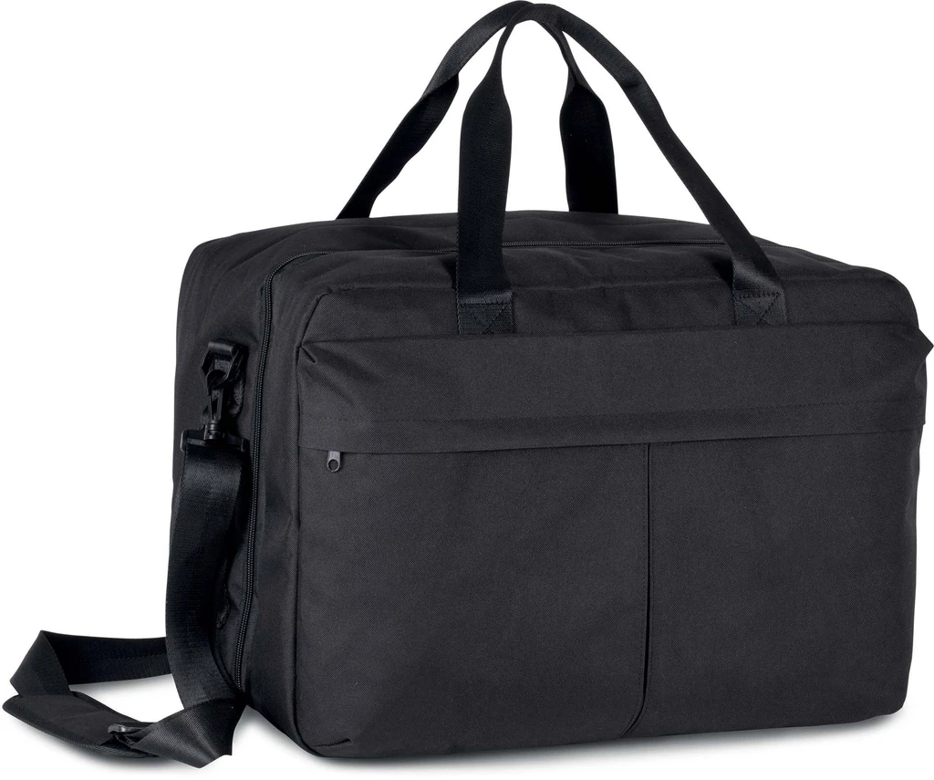 Weekend/travel bag in 600D polyester. Opens easily when flat thanks to a zip all around the bag and optimises storage thanks to mesh compartments on both sides. Large handles (50 cm), adjustable shoulder strap. 1 pocket at the back, which can also be used to fix the bag onto a trolley.