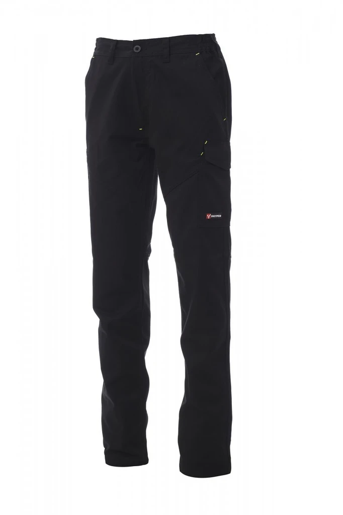 All-season unisex trousers, side elastic and waist belt loops, zip fastening with plastic button, two classic front pockets, one side pocket with LOCK SYSTEM, one tape measure holder, two back pockets, one open and one with Velcro flap, matching stitching and inserts, reflective stripes on the back pocket, triple stitched seams