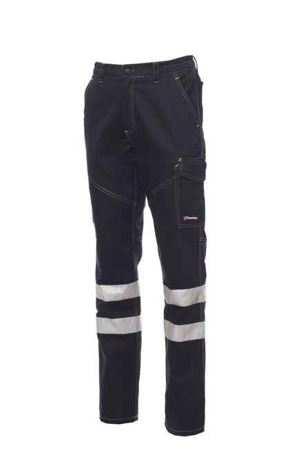 Winter unisex trousers with cat. 1 reflective stripes, side elastic and waist belt loops, zip fastening with plastic button, two classic front pockets, one side pocket with LOCK SYSTEM, one tape measure pocket, two back pockets, one with flap and one open with Velcro flap, contrasting inserts and stitching, reflective stripes on the back pocket, double-stitched seams