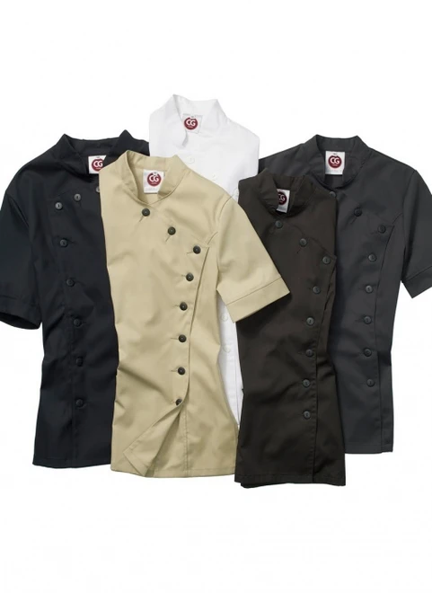 Tailored tunic with short sleeves and mandarin collar. The diagonally cut lapels that can be fastened with buttons are especially smart. The tunic has a side vent as well as a rear pleat for greater mobility. The high quality stretch fabric is very comfortable and easy to care for. Even when washed at 95°C the shape, colours and wear comfort remain unaltered.