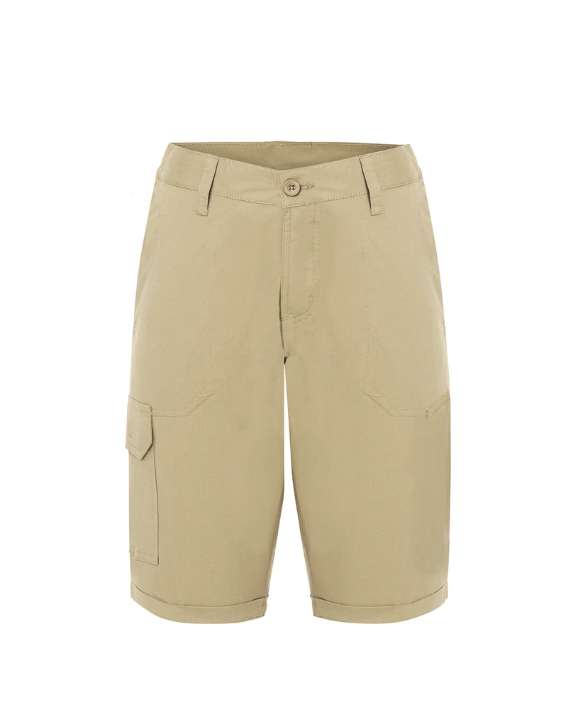 Waistband with side elastic bands and closure with a button. Five belt loops and zipper matching ground colour.