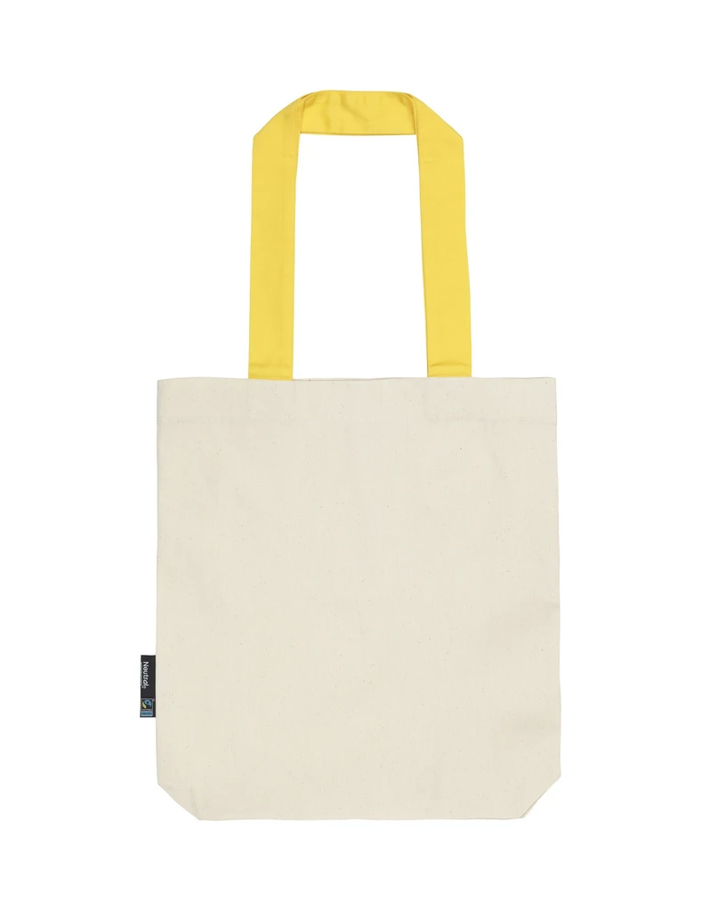 Material: 100% Organic Fairtrade Cotton, twill Weave; Weight: 210gsm; Heavy Twill Weave. Long contrast handles. Reinforced at stress points. Bottom gusset. Sizes: 38 x 42 cm/handles: 66cm; Neutral® & Fairtrade flaglabels at side; Certificates: OEKO-TEX® STANDARD 100, 100% CERTIFIED ORGANIC COTTON, FAIR WEAR, EU ECOLABEL, SA8000, NEUTRAL® RESPONSIBILITY