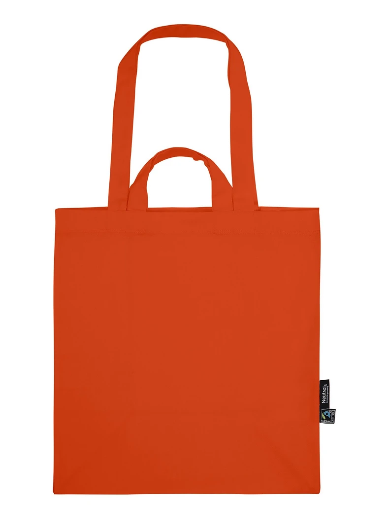 Material: 100% Organic Fairtrade Cotton, twill Weave; Weight: 210gsm; Heavy Twill Weave. Long & short handles (60 cm; 24cm. Bottom & side gusset. Reinforced at stress points. Sizes: 35 x 38 cm; Neutral® & Fairtrade flaglabels at side; Certificates: OEKO-TEX® STANDARD 100, 100% CERTIFIED ORGANIC COTTON, FAIR WEAR, EU ECOLABEL, SA8000, NEUTRAL® RESPONSIBILITY
