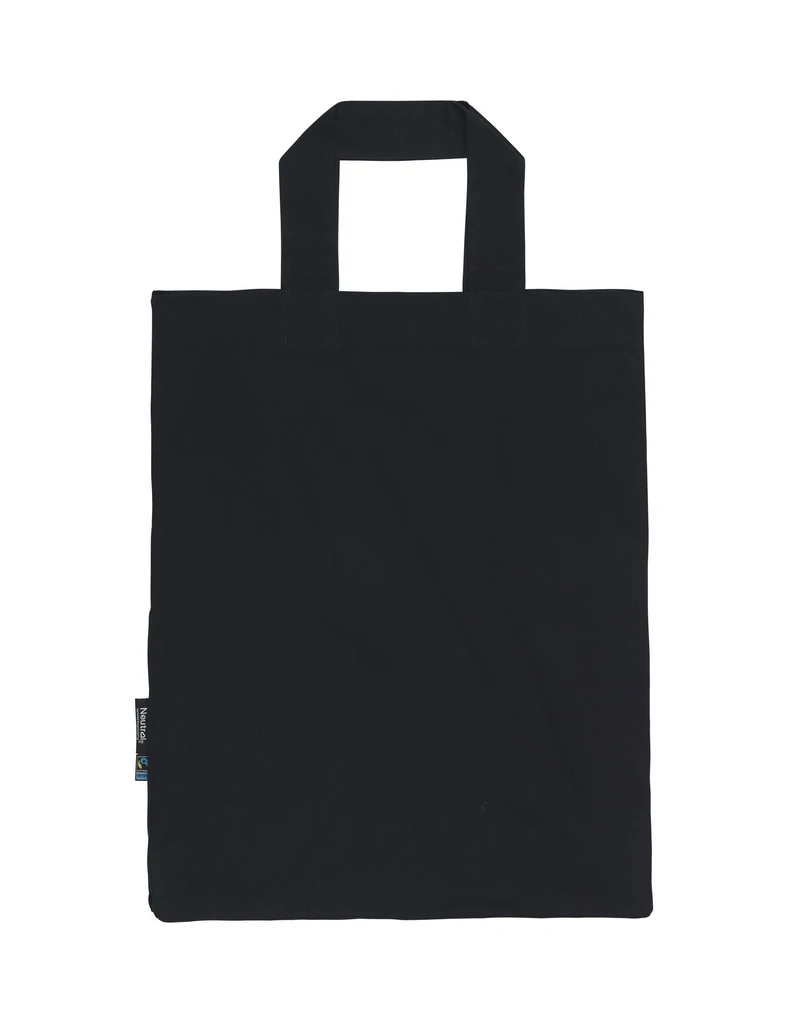 Material: 100% Organic Fairtrade Cotton, twill weave; Weight: 210gsm; Heavy Twill Weave. Short handles (36 cm), Sizes: 35 x 44 cm. Reinforced at stress points. Bottom & side gusset. Neutral® & Fairtrade flaglabels at side; Certificates: OEKO-TEX® STANDARD 100, 100% CERTIFIED ORGANIC COTTON, FAIR WEAR, EU ECOLABEL, SA8000, NEUTRAL® RESPONSIBILITY