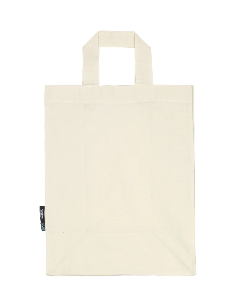 Material: 100% Organic Fairtrade Cotton, twill weave; Weight: 210gsm; Heavy Twill Weave. Short handles (36 cm), Sizes: 35 x 44 cm. Reinforced at stress points. Bottom & side gusset. Neutral® & Fairtrade flaglabels at side; Certificates: OEKO-TEX® STANDARD 100, 100% CERTIFIED ORGANIC COTTON, FAIR WEAR, EU ECOLABEL, SA8000, NEUTRAL® RESPONSIBILITY