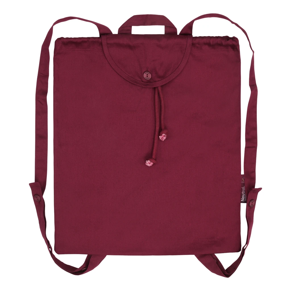 Backpack in twill weave with cotton buttons at straps. Completed with Neutral® and Fairtrade flag labels at side. Available in six colours.