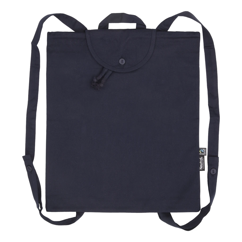Backpack in twill weave with cotton buttons at straps. Completed with Neutral® and Fairtrade flag labels at side. Available in six colours.