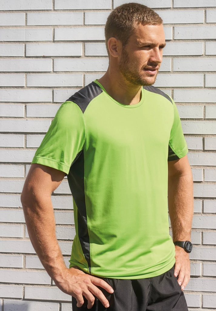 92 % polyester / 8 % elastane 160 gsm. Textured mesh yokes 94 % polyester / 6 % elastane 180 gsm. Quick-drying fabric. Lightweight soft fabric designed for multi sports activities. Textured mesh side, shoulder and under sleeve panels for greater freedom of movement.