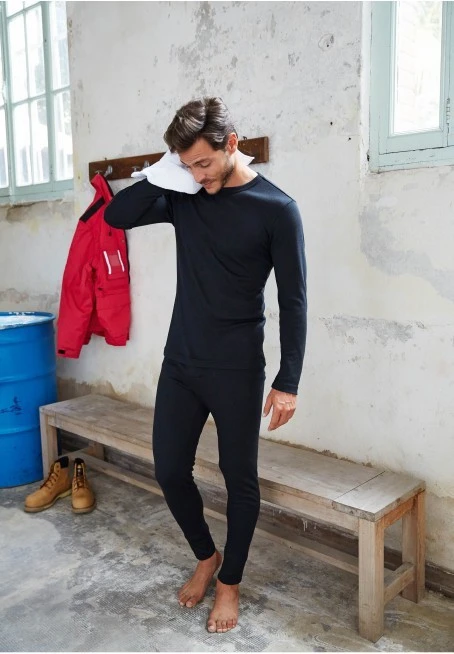 80% polyester / 20% viscose. Warm underwear. Crew neck. Twin needle finishing.