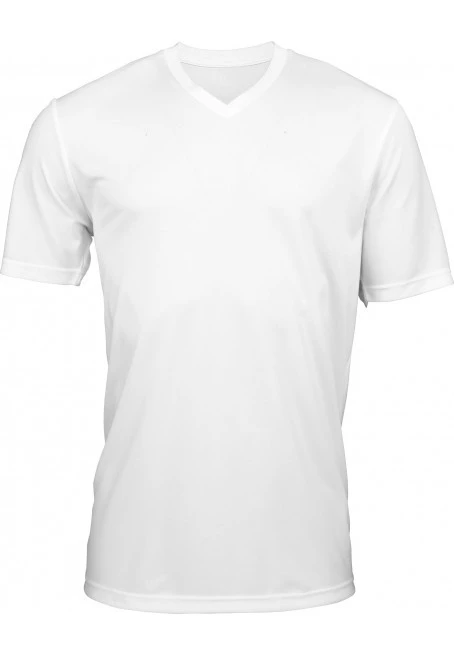 100% polyester. Quick drying fabric. Ribbed V-neck. Twin needle finishing. Ideal for sublimation print.
