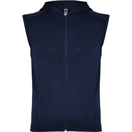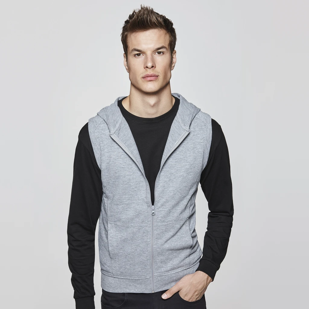 Body warmer with hood, armholes with wide trim in the same fabric. Seam in shoulder as detail, creating yoke on top front. Wide cuff on hems in 1x1 rib. Central zip on front and side pockets kangaroo style. Side twizzers.