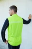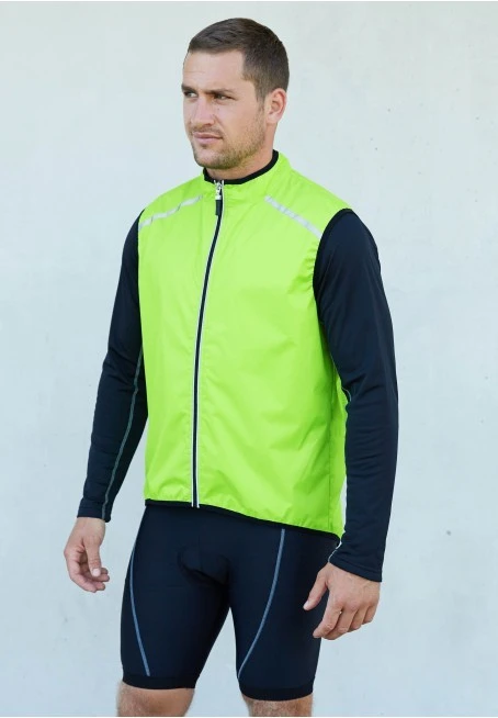 100% polyester pongee 300T. Back mesh 100 g/m². Waterproof 5,000 mm. Breathable 2,000 g/m²/24 hours. Reflective strips on front, back and zip. Elasticated edges.