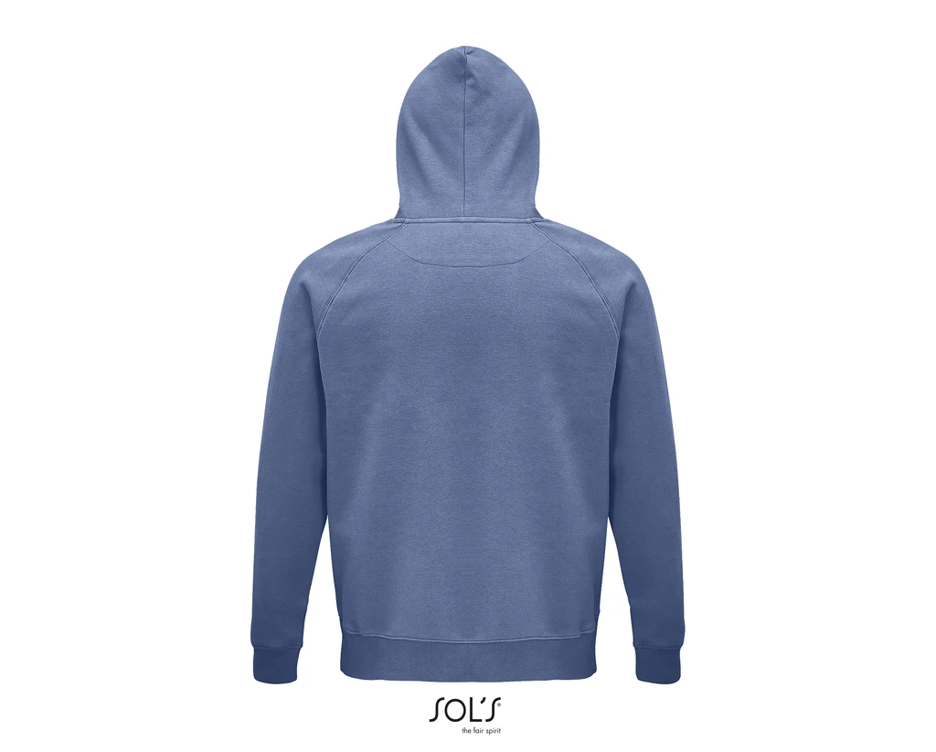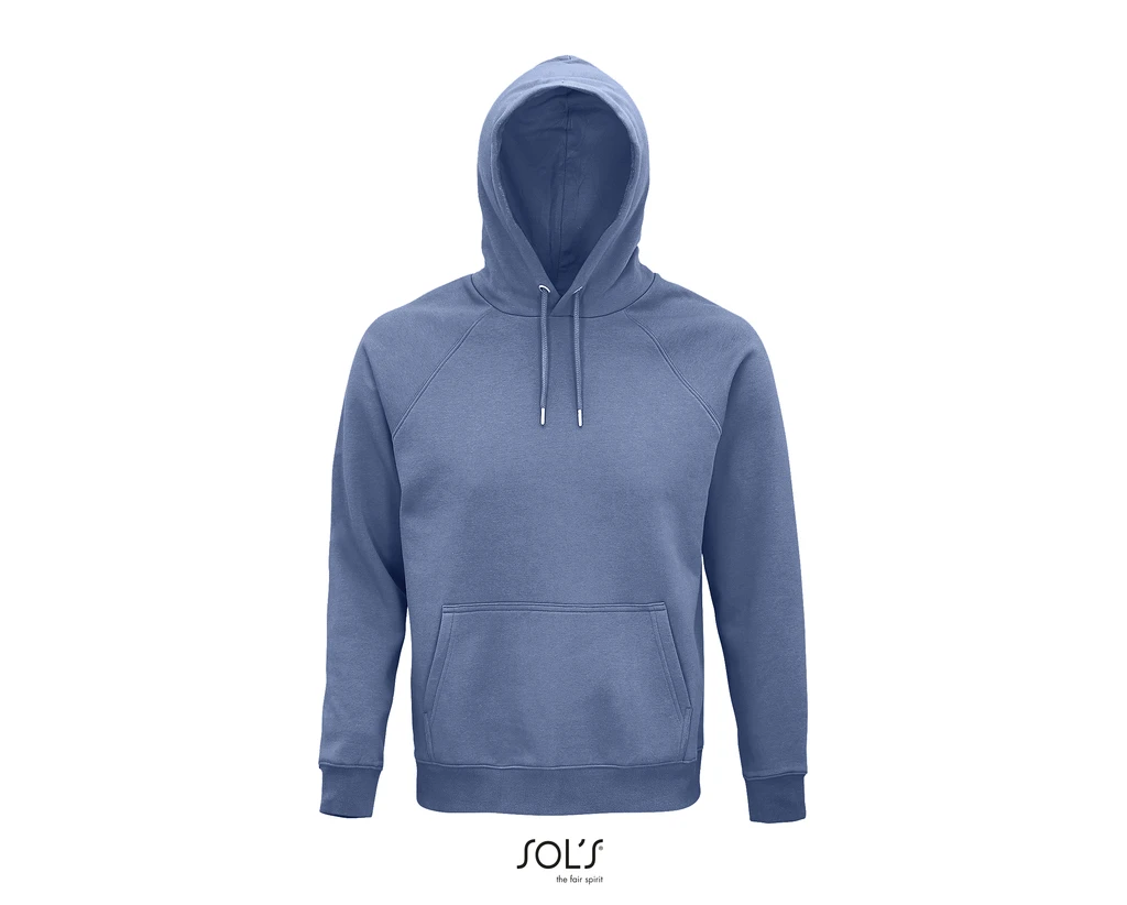 Material: FLEECE 280 - 80% organically grown cotton - 20% recycled polyester, 3 yarns, brushed lining, outside: 100% organic cotton; Cut and sewn, Raglan sleeves, 2x2 ribbed cuffs and hem, half moon inside collar, neck tape, drawstring with metal eyelets and stoppers, Jersey lined hood
