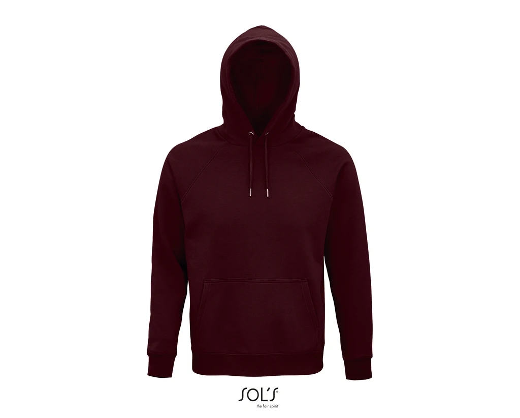 Material: FLEECE 280 - 80% organically grown cotton - 20% recycled polyester, 3 yarns, brushed lining, outside: 100% organic cotton; Cut and sewn, Raglan sleeves, 2x2 ribbed cuffs and hem, half moon inside collar, neck tape, drawstring with metal eyelets and stoppers, Jersey lined hood