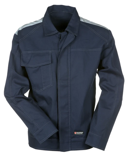 Unisex lightweight all-season jacket, front fastening with plastic buttons and flap, button cuffs, adjustable waist with Velcro. Contrasting stitching, smartphone pocket, detachable badge holder and pen holder in the breast pocket with flap and Velcro. Reflective inserts on the shoulders and back, jeans-style fitted model