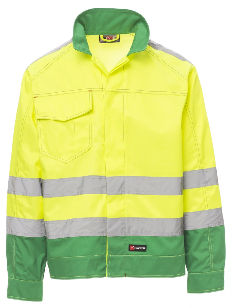 All season unisex lightweight high visibility jacket with reflective stripes, front fastening with plastic buttons and flap, cuff button fastening, adjustable hem with Velcro. Contrasting stitching, smartphone pocket, detachable badge holder and pen holder in the chest pocket with flap and Velcro, jeans-style fitted model