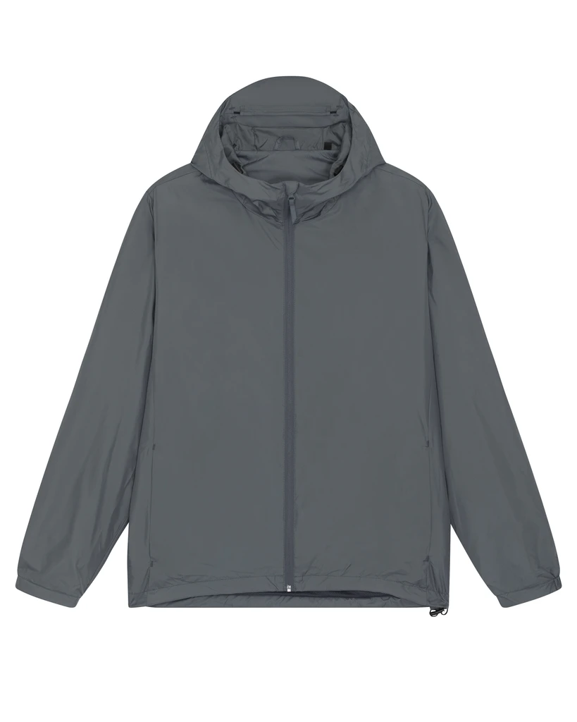 Material: 100% Recycled polyester, Fluorine-free DWR; Weight: 75gsm; Medium Fit, set-in sleeve, longer back length with curved hem for protection. bottom hem with adjustable plastic stopper and elastic cord, sealed hood visor and sealed welt pockets, double layered hood with adjustable plastic stopper and elastic cord on inside, reverse nylon zip at center front with chin guard, zipped welt pockets with extra grosgrain puller, side panels for better shape, semi-elastic sleeve cuff, self fabric half moon at back neck, inside zip opening at bottom hem and wearer's left chest for easy decoration; Certificates: Global Recycled Standard (GRS), Fair Wair, STANDARD 100 by OEKO-TEX®, Peta - Approved VEGAN