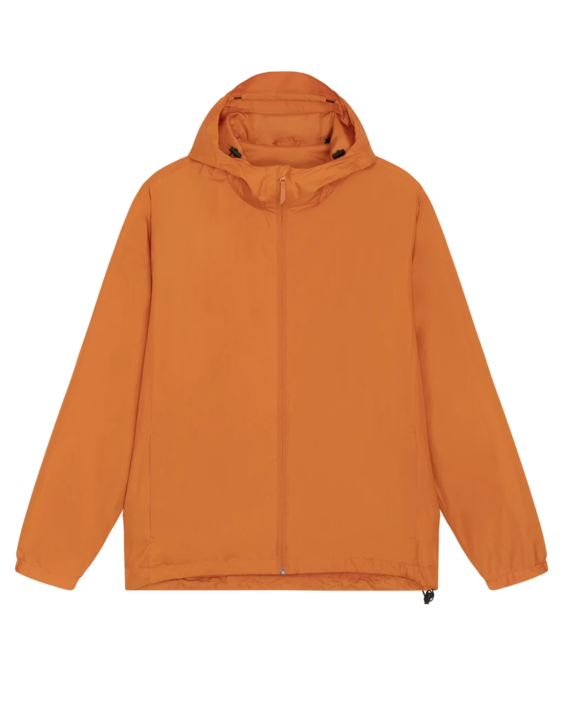Material: 100% Recycled polyester, Fluorine-free DWR; Weight: 75gsm; Medium Fit, set-in sleeve, longer back length with curved hem for protection. bottom hem with adjustable plastic stopper and elastic cord, sealed hood visor and sealed welt pockets, double layered hood with adjustable plastic stopper and elastic cord on inside, reverse nylon zip at center front with chin guard, zipped welt pockets with extra grosgrain puller, side panels for better shape, semi-elastic sleeve cuff, self fabric half moon at back neck, inside zip opening at bottom hem and wearer's left chest for easy decoration; Certificates: Global Recycled Standard (GRS), Fair Wair, STANDARD 100 by OEKO-TEX®, Peta - Approved VEGAN