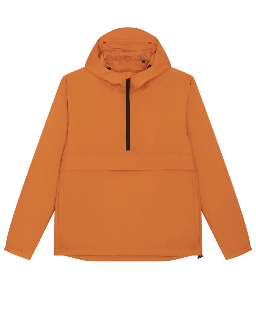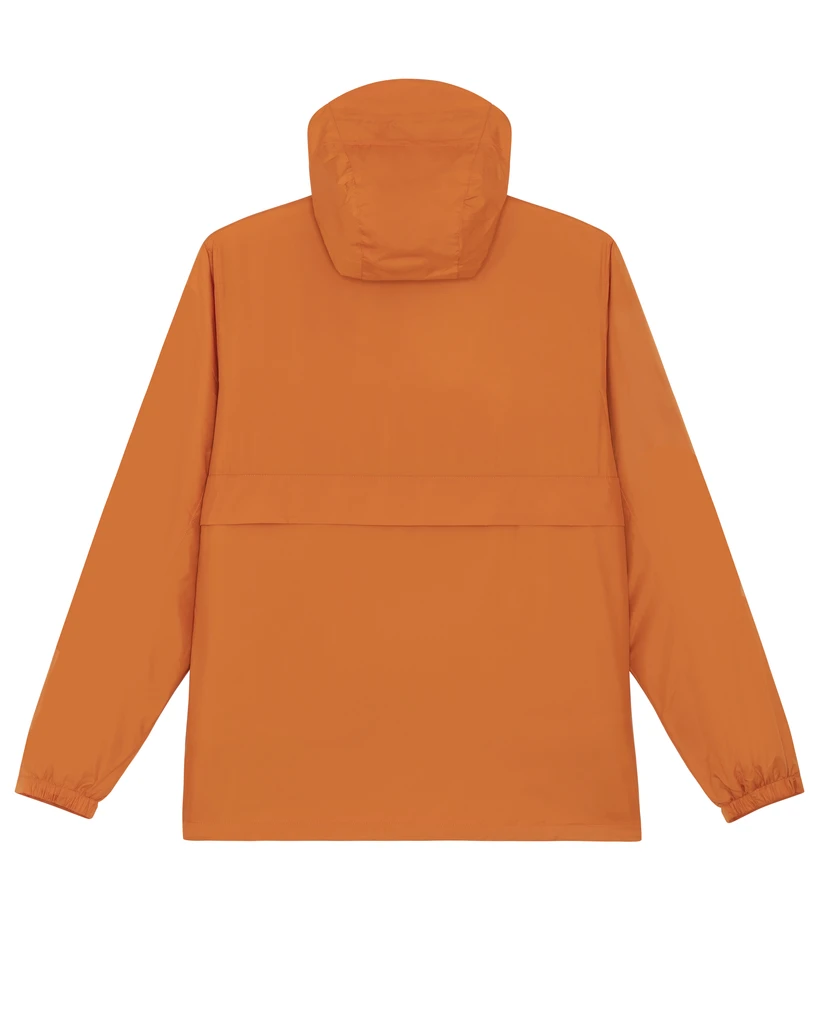 Material: 100% Recycled polyester, Fluorine-free DWR; Weight: 75gsm; Medium Fit, set-in sleeve, longer back length with curved hem for protection, bottom hem with adjustable plastic stopper and elastic cord, sealed hood visor, double layered hood with adjustable plastic stopper and elastic cord on inside, reverse nylon zip at center front with chin guard, zipped welt pockets with extra grosgrain puller, non functional flap front and back, semi-elastic sleeve cuff, self fabric half moon at back neck, inside zip opening at bottom hem and inside loop with snap at armhole for easy access for chest decoration; Certificates: Global Recycled Standard (GRS), Fair Wair, STANDARD 100 by OEKO-TEX®, Peta - Approved VEGAN