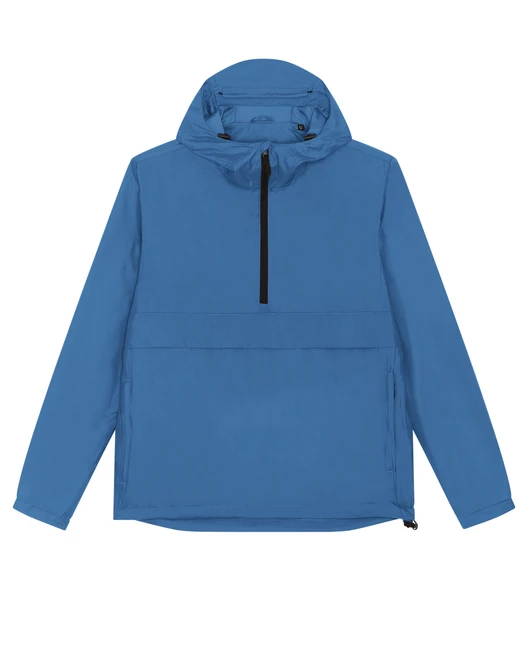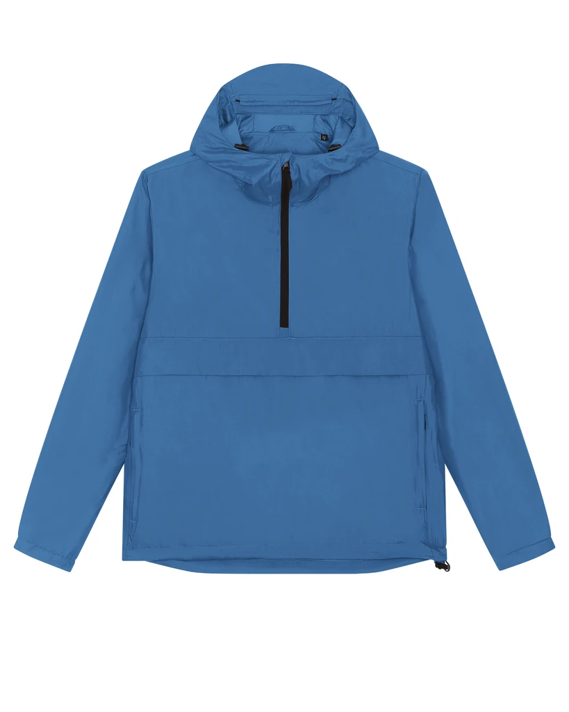 Material: 100% Recycled polyester, Fluorine-free DWR; Weight: 75gsm; Medium Fit, set-in sleeve, longer back length with curved hem for protection, bottom hem with adjustable plastic stopper and elastic cord, sealed hood visor, double layered hood with adjustable plastic stopper and elastic cord on inside, reverse nylon zip at center front with chin guard, zipped welt pockets with extra grosgrain puller, non functional flap front and back, semi-elastic sleeve cuff, self fabric half moon at back neck, inside zip opening at bottom hem and inside loop with snap at armhole for easy access for chest decoration; Certificates: Global Recycled Standard (GRS), Fair Wair, STANDARD 100 by OEKO-TEX®, Peta - Approved VEGAN