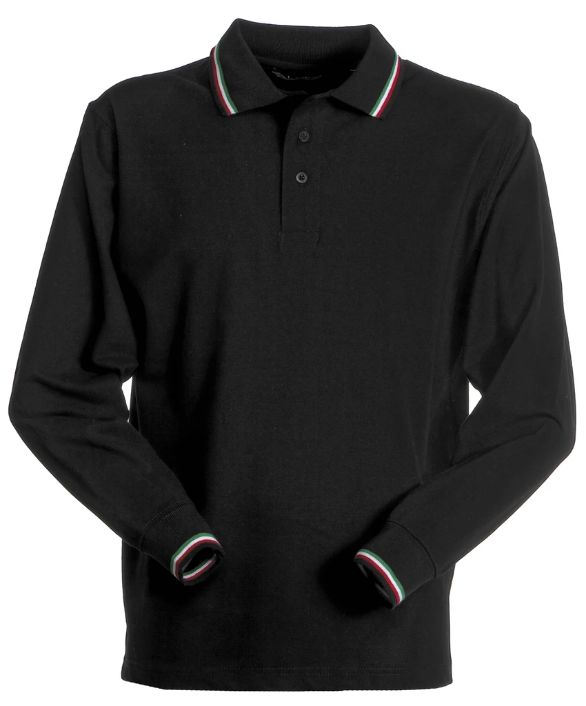 Unisex long-sleeved polo shirt with 3 matching buttons, collar and sleeve trim (colours of the flag), rib collar and cuffs, side vents, concealed collar stitching, side reinforcement tape, inner neck tape