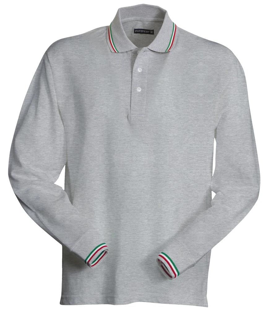 Unisex long-sleeved polo shirt with 3 matching buttons, collar and sleeve trim (colours of the flag), rib collar and cuffs, side vents, concealed collar stitching, side reinforcement tape, inner neck tape