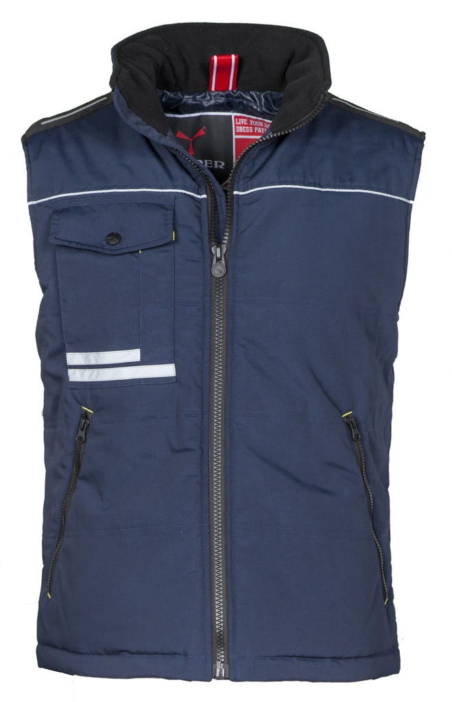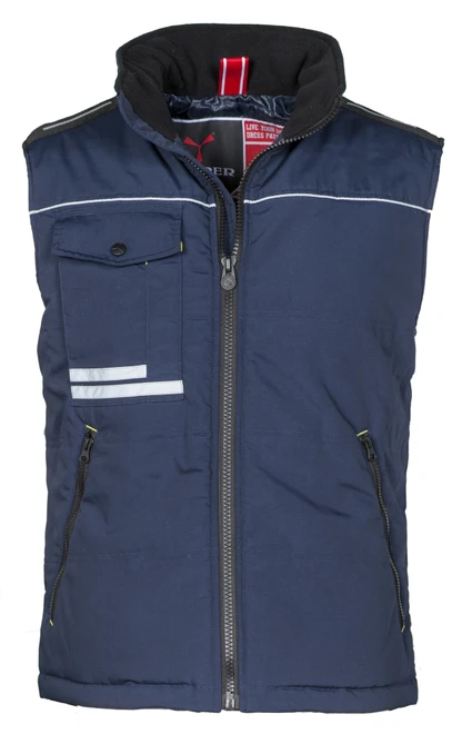 Unisex vest, 8 mm plastic zip with metal pull, contoured back, two roomy outer pockets with zip, roomy multi-function breast pocket, smartphone pocket and reflective stripes, badge holder ring. Padded, high-density lining, inner fleece collar, one pocket