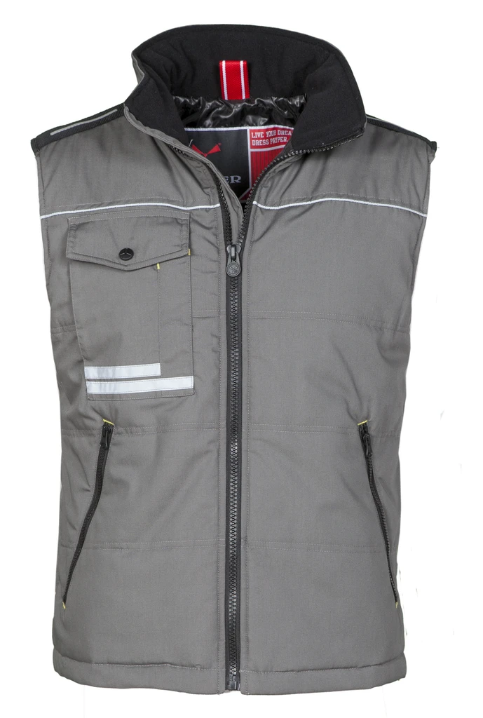 Unisex vest, 8 mm plastic zip with metal pull, contoured back, two roomy outer pockets with zip, roomy multi-function breast pocket, smartphone pocket and reflective stripes, badge holder ring. Padded, high-density lining, inner fleece collar, one pocket