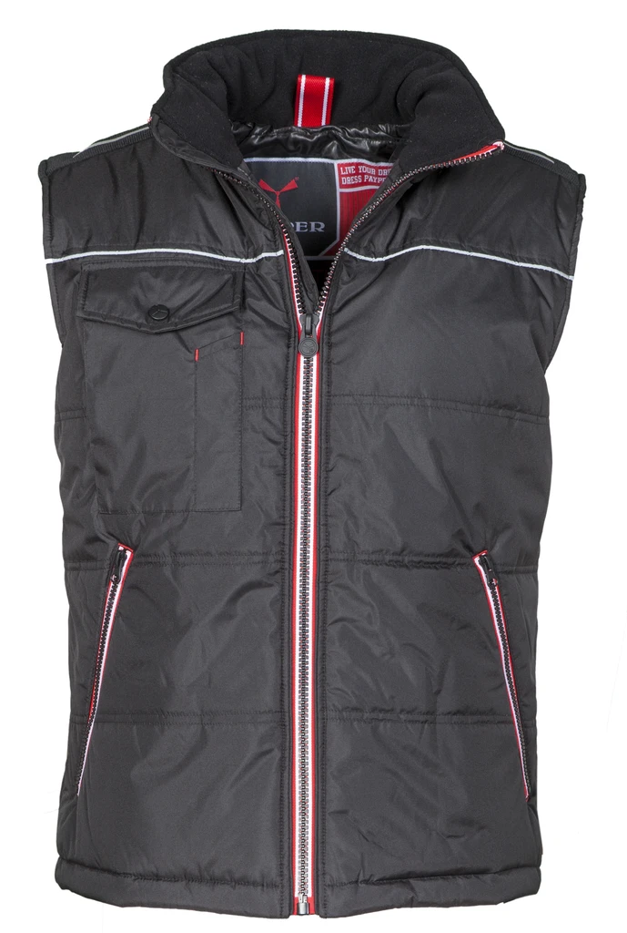 Unisex vest, contrasting 8 mm plastic zip with metal pull, contoured back, two roomy outer pockets with zip, roomy breast pocket for smartphone, badge holder ring, reflex piping on the chest and back. Padded, high-density lining, inner fleece ‘collar, one inner pocket