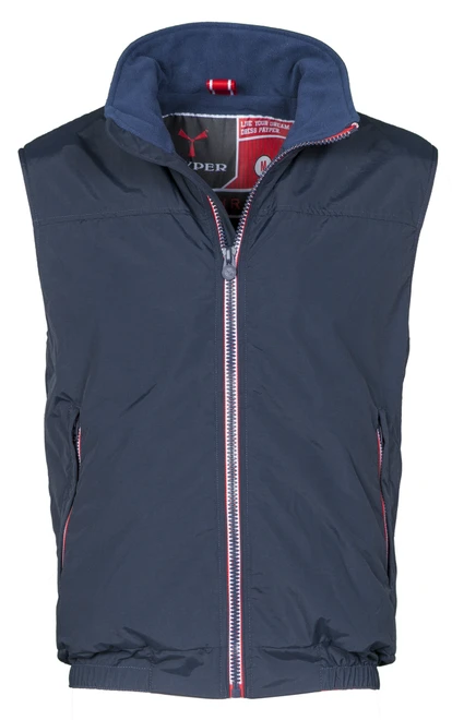 Unisex vest, contrasting 8 mm zip, elasticated hem, two outer pockets with concealed zip. Padded, micro-fleece lining on the inside collar and back, one inner zip pocket for headphones and smartphone headphones, zip on the chest and at the bottom for easier printing and embroidery